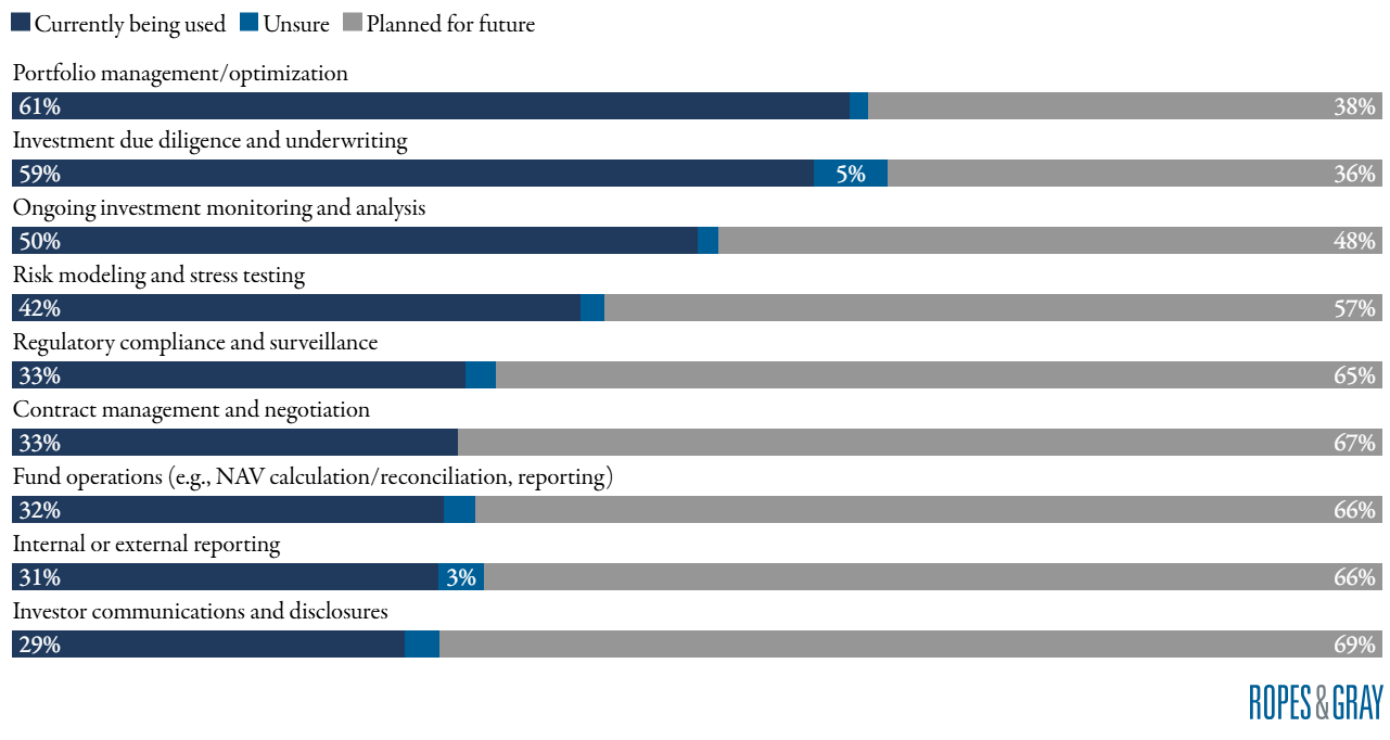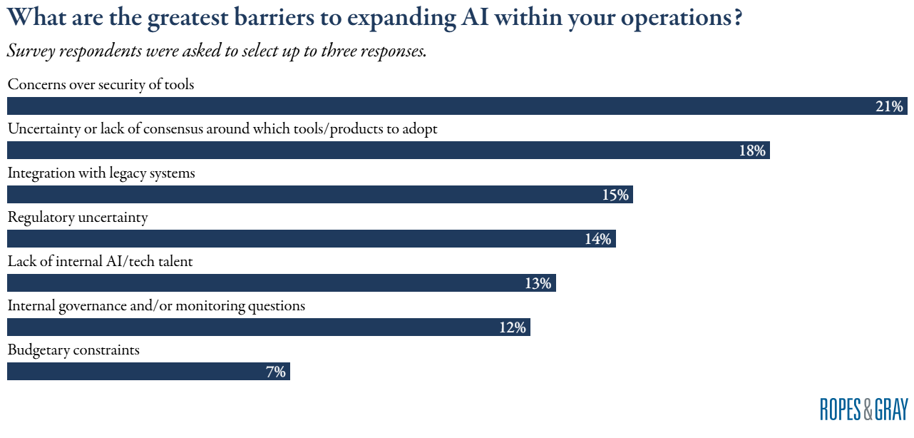 However, investment managers face concerns and barriers when considering the use of Al. According to the survey results, security of the tools and product indecision are top of the list. To allay these, clients can leverage Ropes & Gray’s experience. When clients are unable to invest time and money vetting and configuring software tools, Ropes & Gray can advise them.